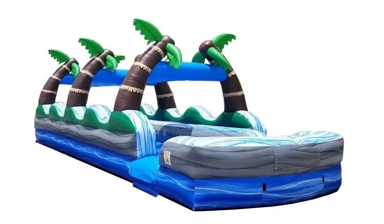 Turn your backyard into a tropical paradise with our 35’ Dual Lane Tropical Slip N Slide! This massive inflatable features two side-by-side lanes, letting guests race each other through a refreshing water-filled adventure. With its bright green palm trees, ocean-blue lanes, and tropical accents, it’s the perfect way to beat the heat and keep the fun going all day long.