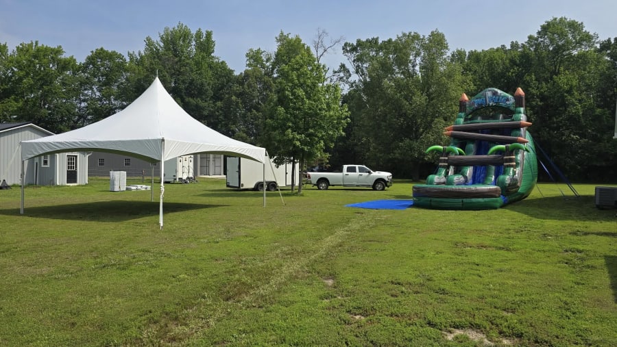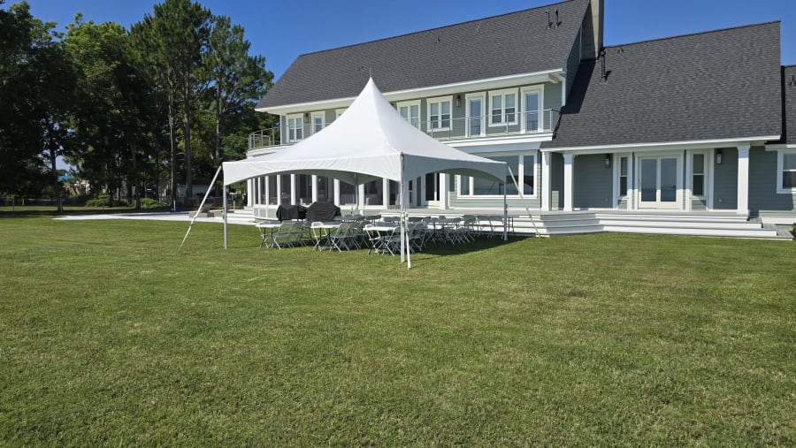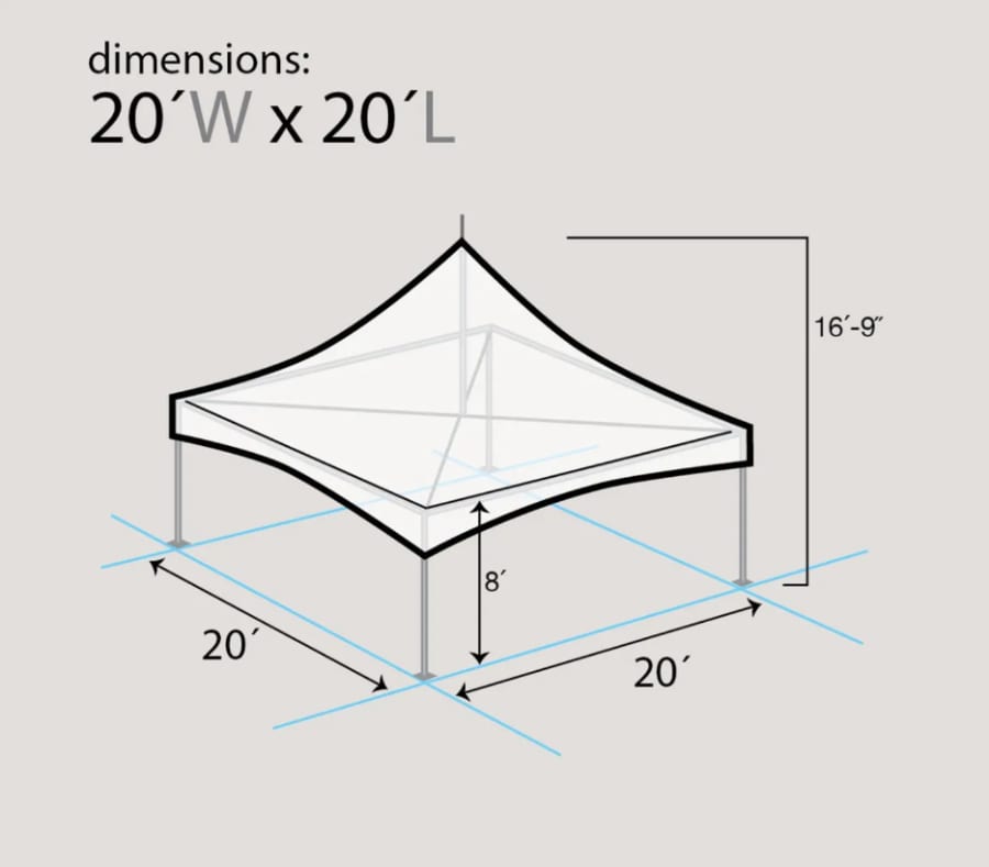 Our 20x20 High Peak Tent provides 400 square feet of covered space, comfortably accommodating up to 40 guests seated at tables or up to 60 guests for a standing event. The sleek, modern design offers open sides for great airflow, while optional sidewalls are available for added protection from wind, rain, or sun.